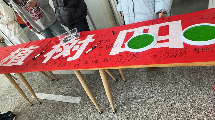 手印创作完成后,活动进入“青春签名承诺”环节。一条写有“植树四十八载,添彩美丽校园”的红色横幅如纽带般铺开,同学们手持马克笔郑重签名。这不仅是一个名字,更是一份庄严承诺。一位刚签完名的同学表示:“以后看到垃圾会主动捡起,看到践踏草坪会上前劝阻,这是为了我们共同的家园。”短短半小时,横幅上便签满密密麻麻的名字,每一笔都承载着对绿色的坚守与对校园的热爱。