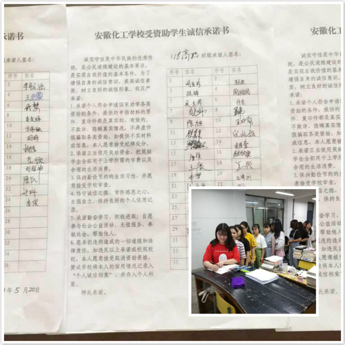 活动期间,学生资助中心组织学校全体受助学生开展了“受助学生诚信承诺”签名活动。号召同学们要正确理解国家助学政策,用好国家、学校助学金,保持勤俭节约的生活习性,恪守诚信之德,常怀感恩之心,勤奋学习,积极进取;自愿参与社会公益活动,无偿服务,奉献社会,帮助他人。