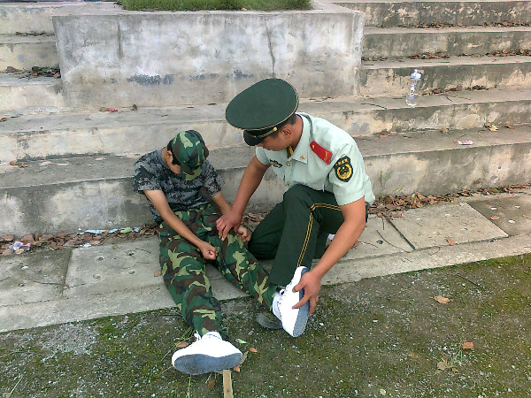 数控仪表1151班一位同学在军训时不小心扭伤脚踝,教官及时处理,关心学生,使学生们感受到了大家庭的温暖。