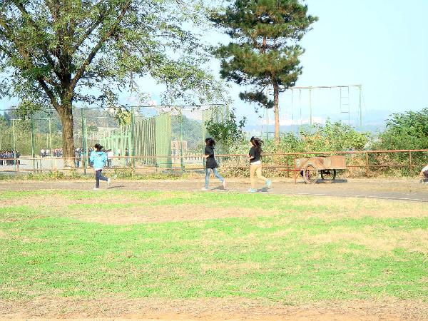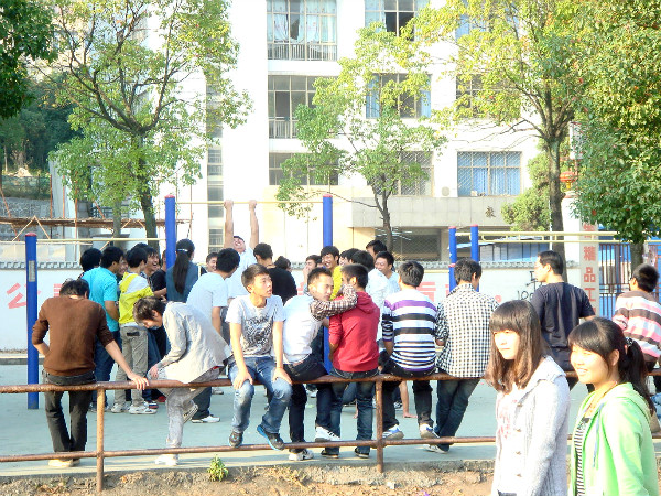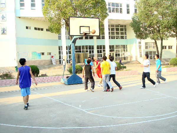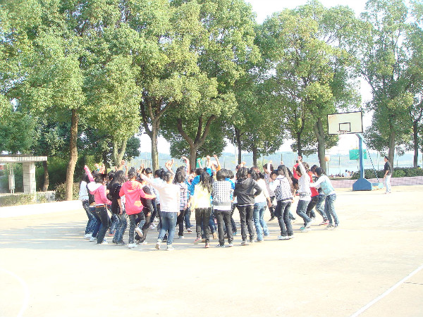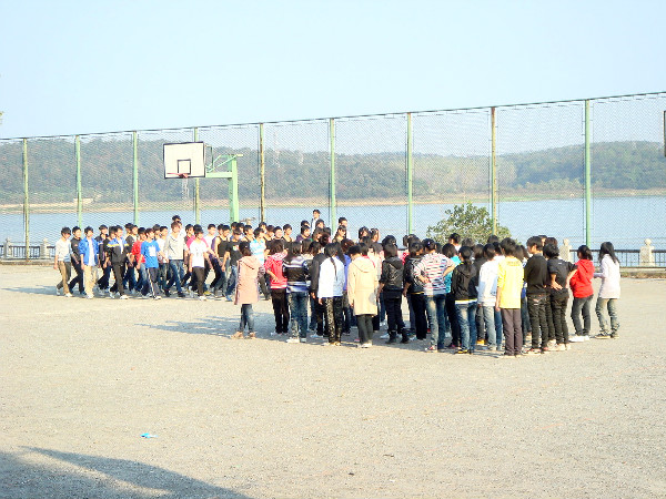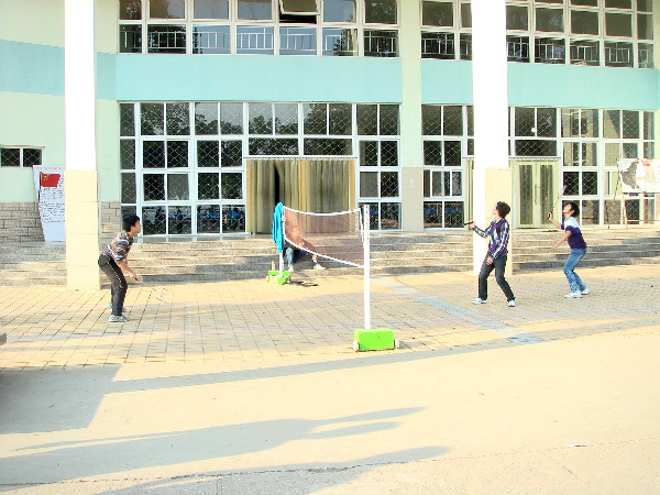看!仪仗队在篮球场整理者队形,运动员们在操场上认真的训练,还有同学在打羽毛球呢!