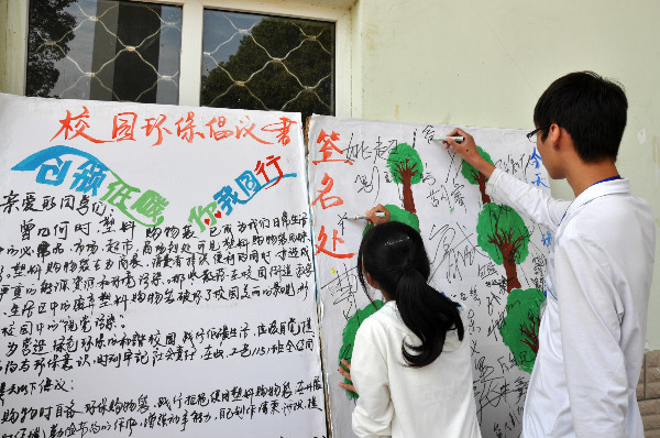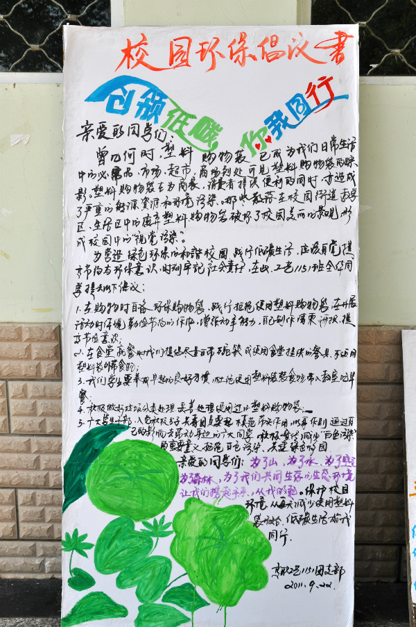 曾几何时,塑料购物袋已成为我们日常生活中的必需品,市场、超市、商场到处可见塑料购物袋的踪影。塑料购物袋在为商家、消费者提供便利的同时,亦造成了严重的能源资源浪费和环境污染。那些散落在校园街道、教学区、生活区中的废弃塑料购物袋破坏了校园的美丽景观,形成校园中的“视觉污染”。